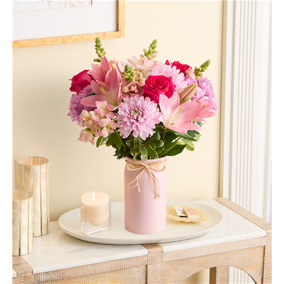 Thank Mom for a lifetime of comforting hugs with our Mother’s Embrace™ bouquet. Lovely pink and lavender blooms are hand-designed in a pink ceramic vase, creating a heartfelt expression of your feelings whether you're celebrating Mother’s Day together or sending a smile from miles away.